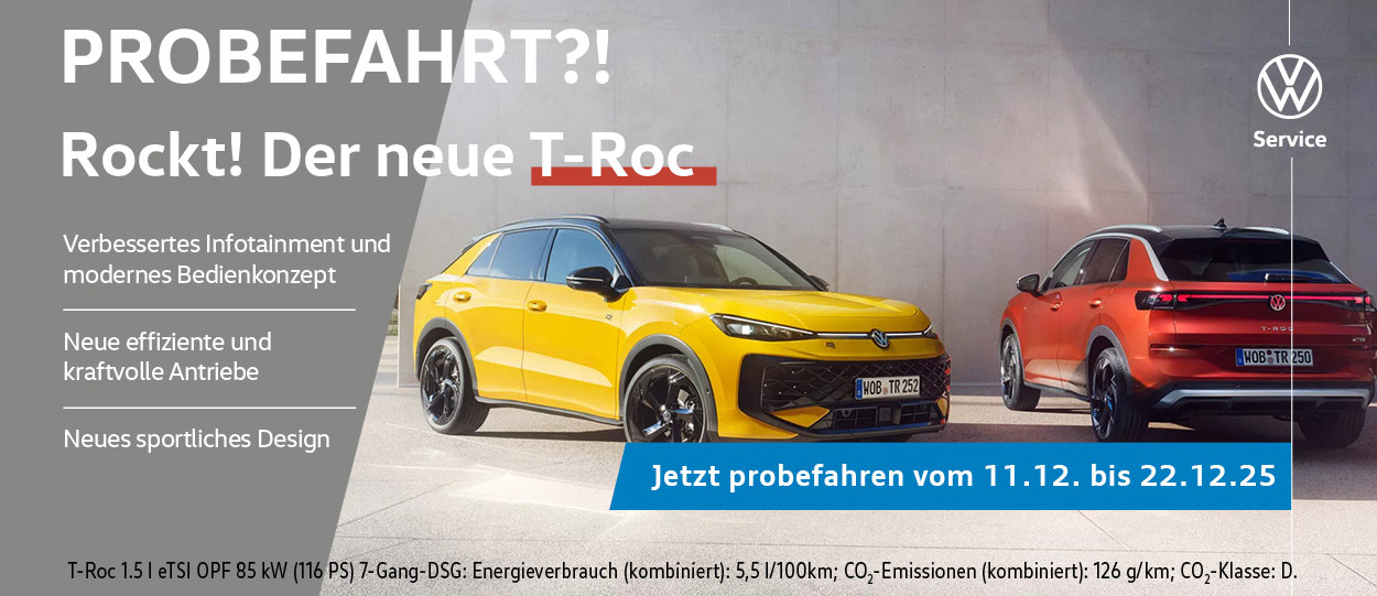 Der neue Volkswagen T-Roc setzt neue Maßstäbe in seiner Klasse! Erleben Sie ein Fahrzeug, das mit seinem markanten Design und seiner hochwertigen Ausstattung begeistert. Mit einer beeindruckenden Auswahl an Motorisierungen, die Effizienz und Fahrspaß perfekt vereinen, bietet der T-Roc für jeden Anspruch das Richtige.